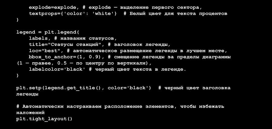 Для круговой диаграммы по статусам станций был использован метод value_counts. В переменные labels и sizes я положила названия статусов и количество станций соответственно.