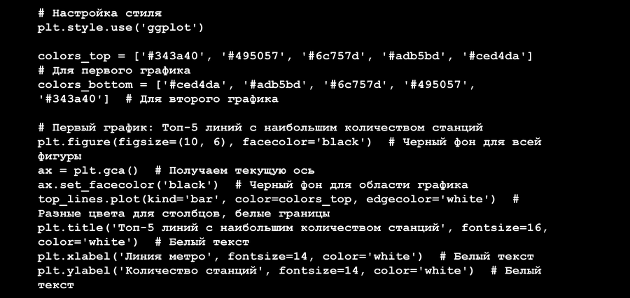 Для столбчатой диаграммы по топу веток с наибольшим и наименьшим количеством станций я использовала метод value_counts и затем отсортировала полученное значение сначала по убыванию, потом по возрастанию и взяла первые 5 значениий для каждой сортировки.