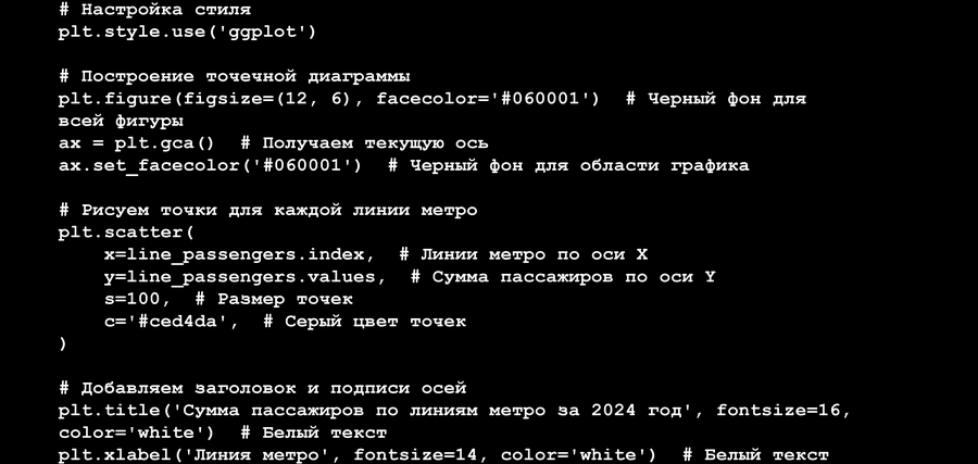 Далее идет точечный график для пассажиропотока по веткам московского метро за 2024 год.