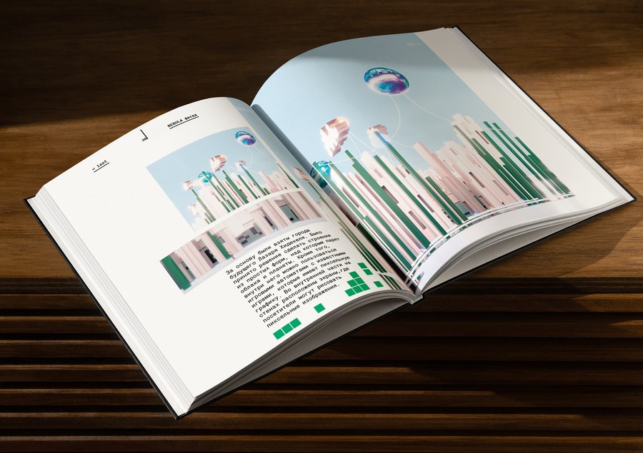 Моя книга-портфолио с проектами, вдохновленными картинами Лазаря Хидекеля. Основная идея: сделать книжку с отсылками на старые игры с пиксельной графикой, тему которых я начинала развивать параллельно с художником.