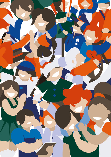 Был выбран стиль геометричной флэт-иллюстрации с чистыми заливками, простой и яркий. Решение оставить людей без лиц в рамках условий концепции принято для того, чтобы зритель мог легче ассоциировать себя с героями иллюстраций.