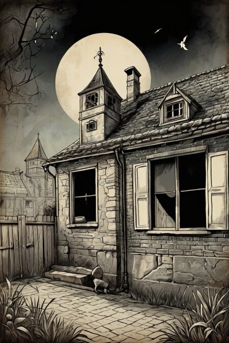 Промпт: Generate an image of an old house in a simple hand-drawn style, this house should be depicted on old yellowed paper. The image should have a slightly gloomy atmosphere