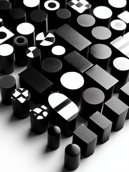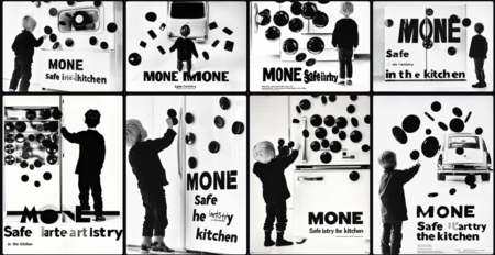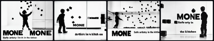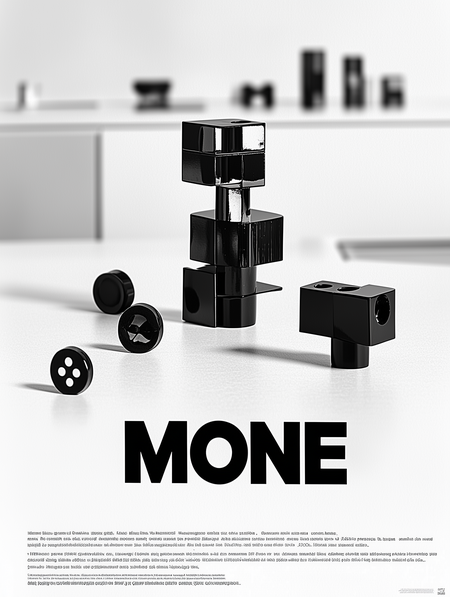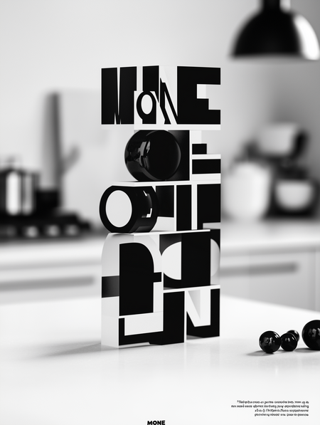 Промт: Advertising poster by Helmut Krone for company «MONE» that creates decorative magnets, strick swiss-style typography at the bootom on white backgound, two-thirds from the top covered by an image of black metalic magnets in the white minimalisitc interior, in the background is blurred kitchen, product shot close up, centered composition