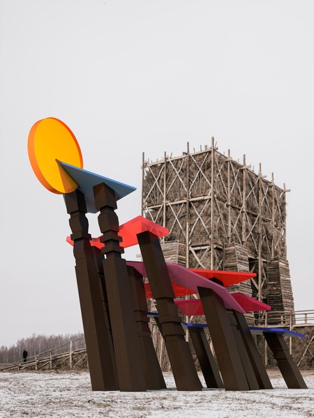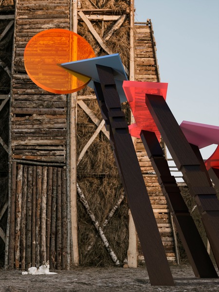 Геометрические объемы выполнены из акрила, а опоры — балки старинного русского дома. Традиционный материал контрапунктом к современному показывает связь прошлого и будущего.