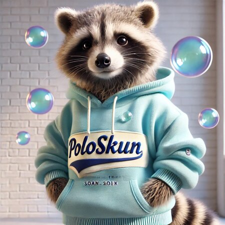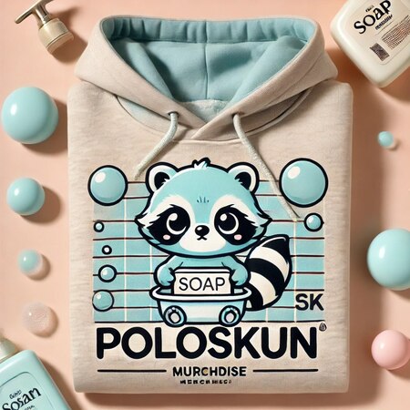 Промпт: создай изображение на котором енот стоит в прачечной, он в мерче от бренда «полоскун»