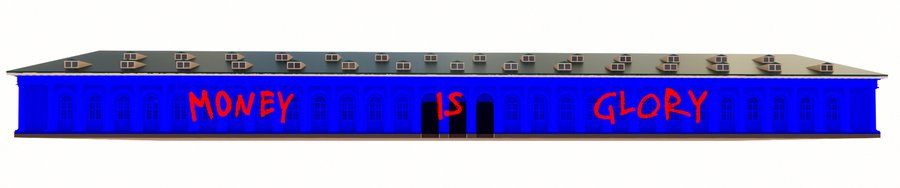 На красных стенах фасада расположены фрагменты разных его работ.