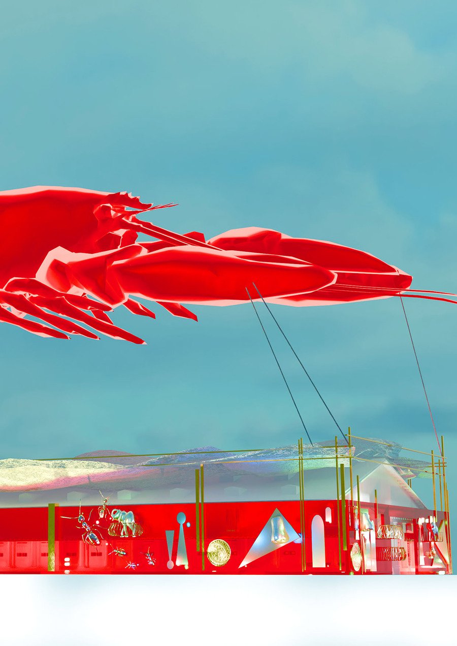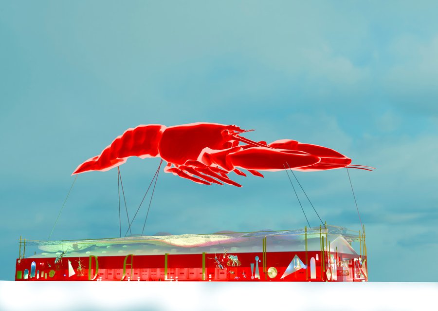 Лобстер представлен в виде надутого шарика, парящего в воздухе.