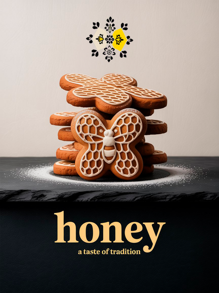 1. A sophisticated product shot advertisement for «Honey» gingerbread, showcasing a stack of intricately decorated gingerbread cookies arranged artfully on a black slate surface against a subtly textured, off-white background. The cookies are dusted with powdered sugar, emphasizing their golden-brown hue and detailed honey-comb patterns, illuminated by soft, diffused light that creates gentle highlights and shadows, highlighting the richness of the gingerbread. The brand logo, a stylized honeybee, is subtly embossed on the bottom cookie, with the text «Honey» displayed in LaBodoni DemiLight font in a warm yellow hue below, and a tagline reading «A Taste of Tradition» in a smaller font size, contributing to a contemporary aesthetic blended with classic Russian design elements and a sense of comforting indulgence. The overall mood is warm, inviting, and premium, reflecting the brand’s focus on quality and heritage.