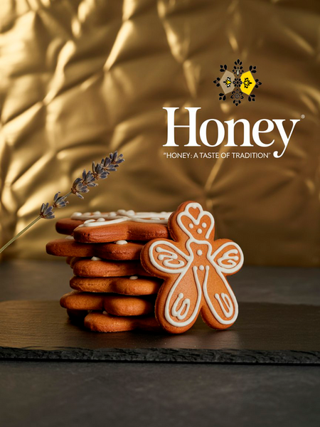 2. A sophisticated product shot advertisement for «Honey» gingerbread, showcasing a stack of intricately decorated gingerbread cookies arranged on a black slate surface against a background of subtly textured gold foil. Warm, diffused lighting highlights the rich amber tones of the honey glaze and the delicate details of the gingerbread, while a single sprig of dried lavender adds a touch of rustic elegance and echoes traditional Russian motifs. The brand logo, a stylized honeybee silhouette, sits subtly to the side, accompanied by the tagline «„Honey: A Taste of Tradition“» rendered in the LaBodoni DemiLight font, conveying a sense of heritage and premium quality with a contemporary, minimalist aesthetic. The overall mood is warm, inviting, and subtly luxurious, aligning with a brand identity that blends Russian heritage with modern sophistication. Создано в Ideogram Лого было добавлено в Adobe Photoshop