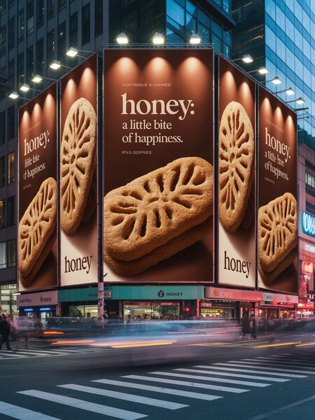 1. A dynamic urban product advertisement showcasing «Honey» gingerbread cookies on a series of large, illuminated billboards in a bustling city street at dusk. Each billboard features a close-up shot of the gingerbread, highlighting the intricate details of the cookie’s surface and the warm, golden-brown color, with strategically placed spotlights creating depth and emphasizing the texture. The billboards are interspersed with neon signs and the blurred movement of pedestrians, creating a sense of energy and excitement, while the tagline «Honey: A Little Bite of Happiness» appears prominently in a modern, elegant font against a contrasting dark background. The overall aesthetic is vibrant and inviting, conveying a sense of indulgence and urban charm.