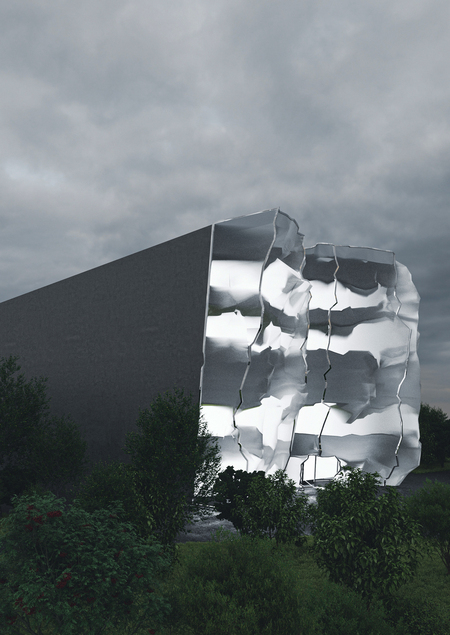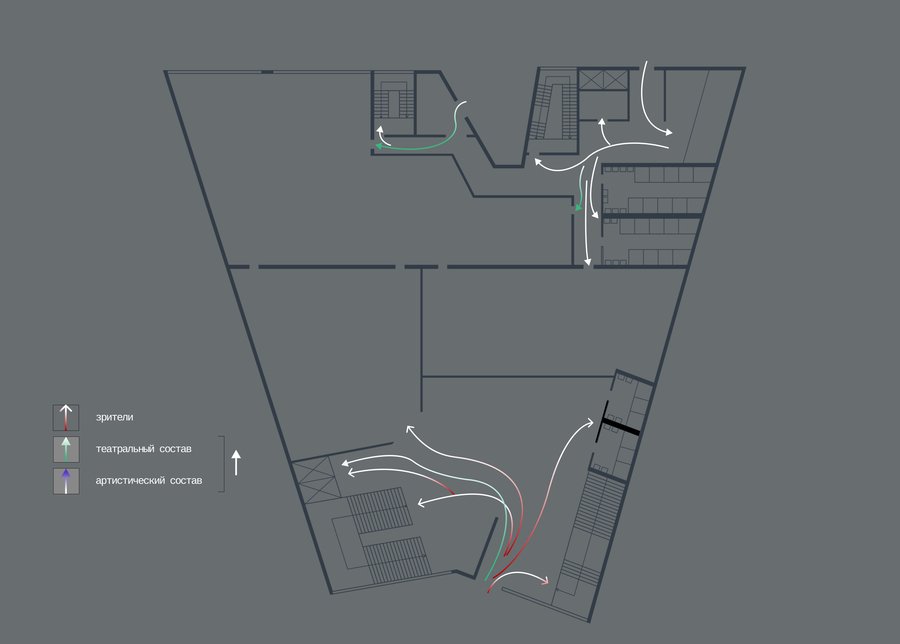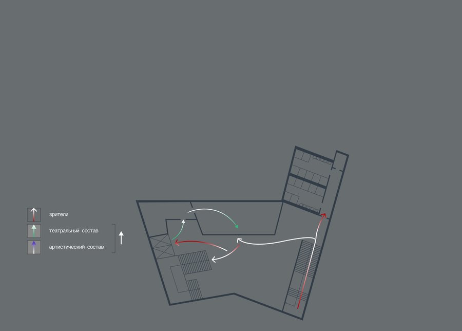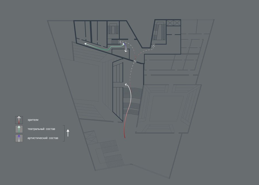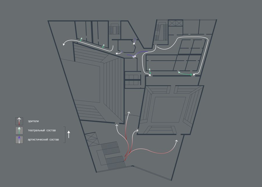 Фасад театра концентрирует эту идею, воплощая в себе сливание с пространством, а после и порыв к созданию чего-то нового — разлом