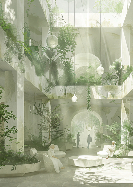promt: people in the hospice communicate, there is a lot of greenery around, white walls, soft chairs. white and pastel green shades --s 250 --v 6.0