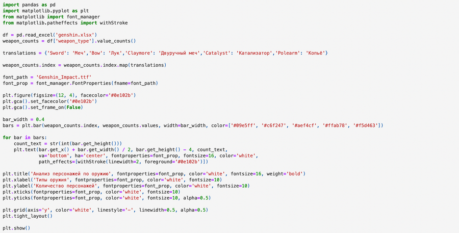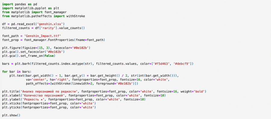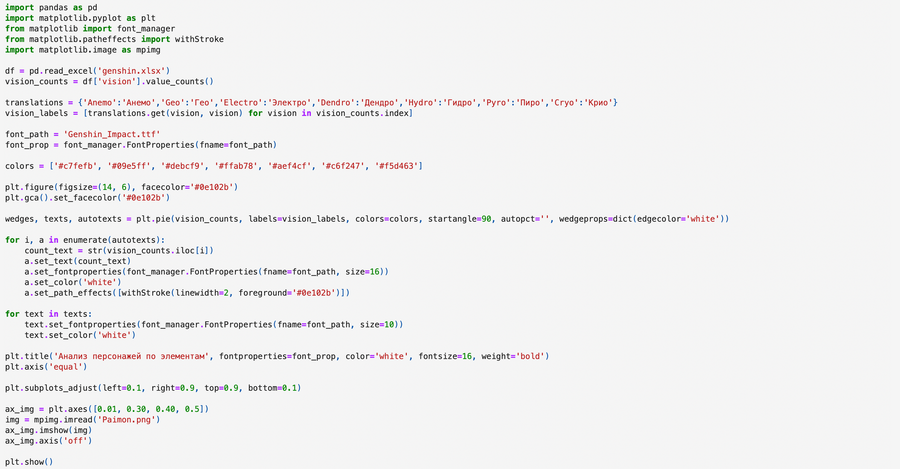 Для цветовой палитры диаграмм я выбрала цвета, соответствующие семи стихийным элементам, которые являются ключевыми в сюжете игры. Это не только добавляет визуализации глубины и гармонии, но и помогает передать атмосферу и тематику проекта, делая анализ более увлекательным и интуитивно понятным.