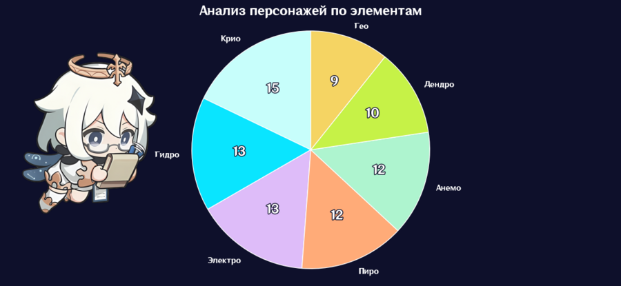 В игре элементы стихий предоставляют персонажам уникальные способности, которые помогают им в сражениях. Круговая диаграмма демонстрирует, что наибольшее количество персонажей относится к категории «крио», то есть управление льдом.