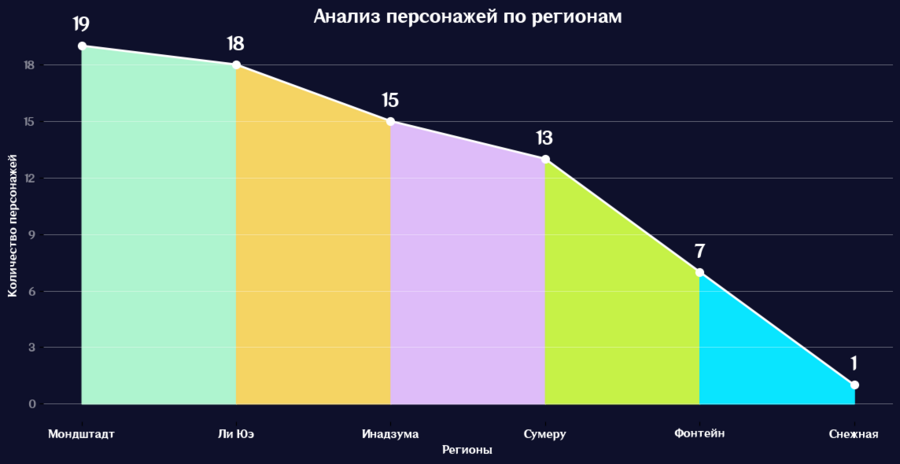 Согласно данным линейного графика, наибольшее количество персонажей связано с регионом Мондштадт. Это вполне ожидаемо, ведь именно здесь начинается наше путешествие, и большинство героев в игре изначально представлены именно этим регионом.