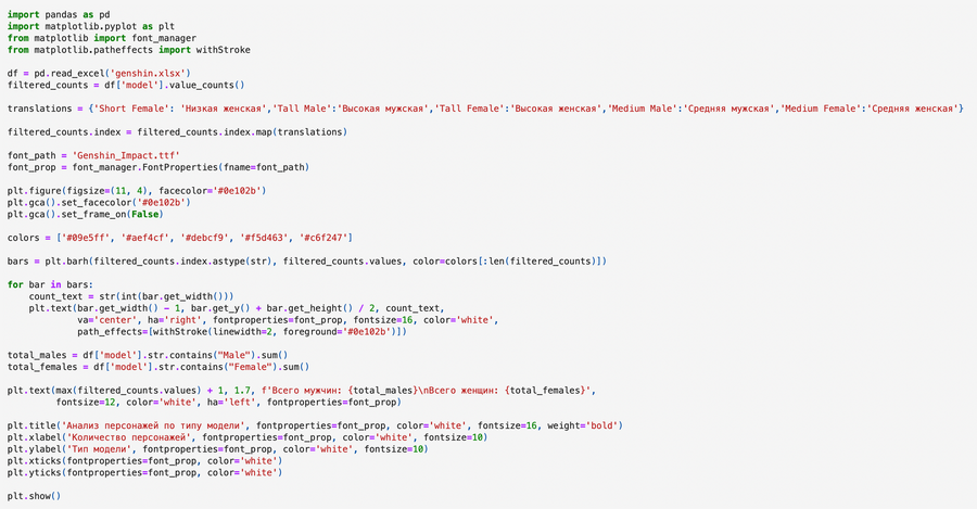 Все игровые персонажи в Genshin Impact используют одну из пяти типов моделей, которые определяют их рост и пол. Анализ данных показывает, что как среди мужчин, так и среди женщин наибольшее количество персонажей имеет средний рост (подростки и молодые люди). Это создаёт образ динамичных и энергичных героев, которые легко ассоциируются с игровым процессом.