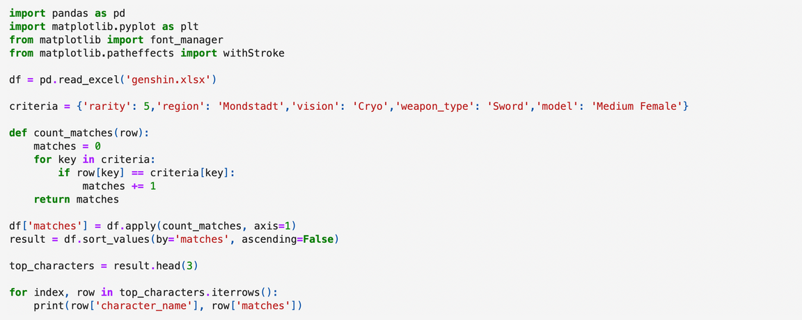 Теперь с помощью кода я смогу определить персонажа, наиболее соответствующего этим критериям или имеющего максимальное количество совпадений.
