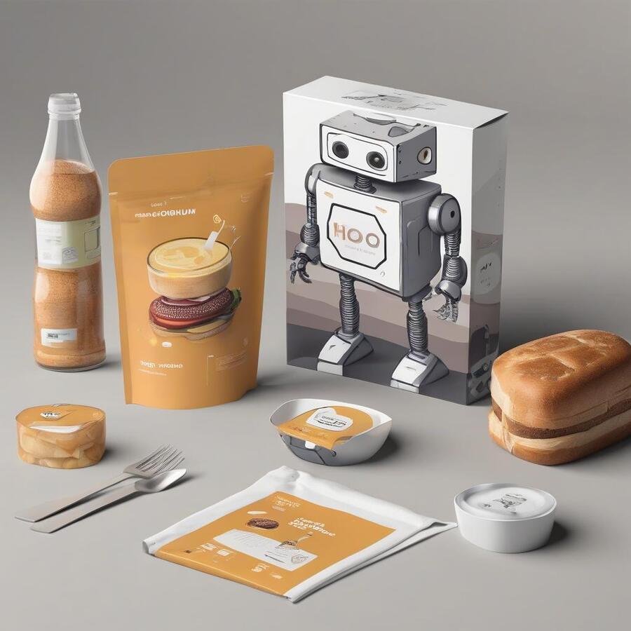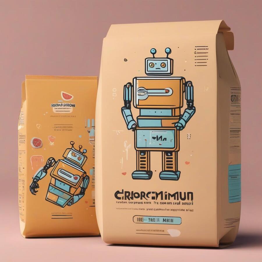 art of robot on the food package, a mockup of a food. merch of the app for home robots