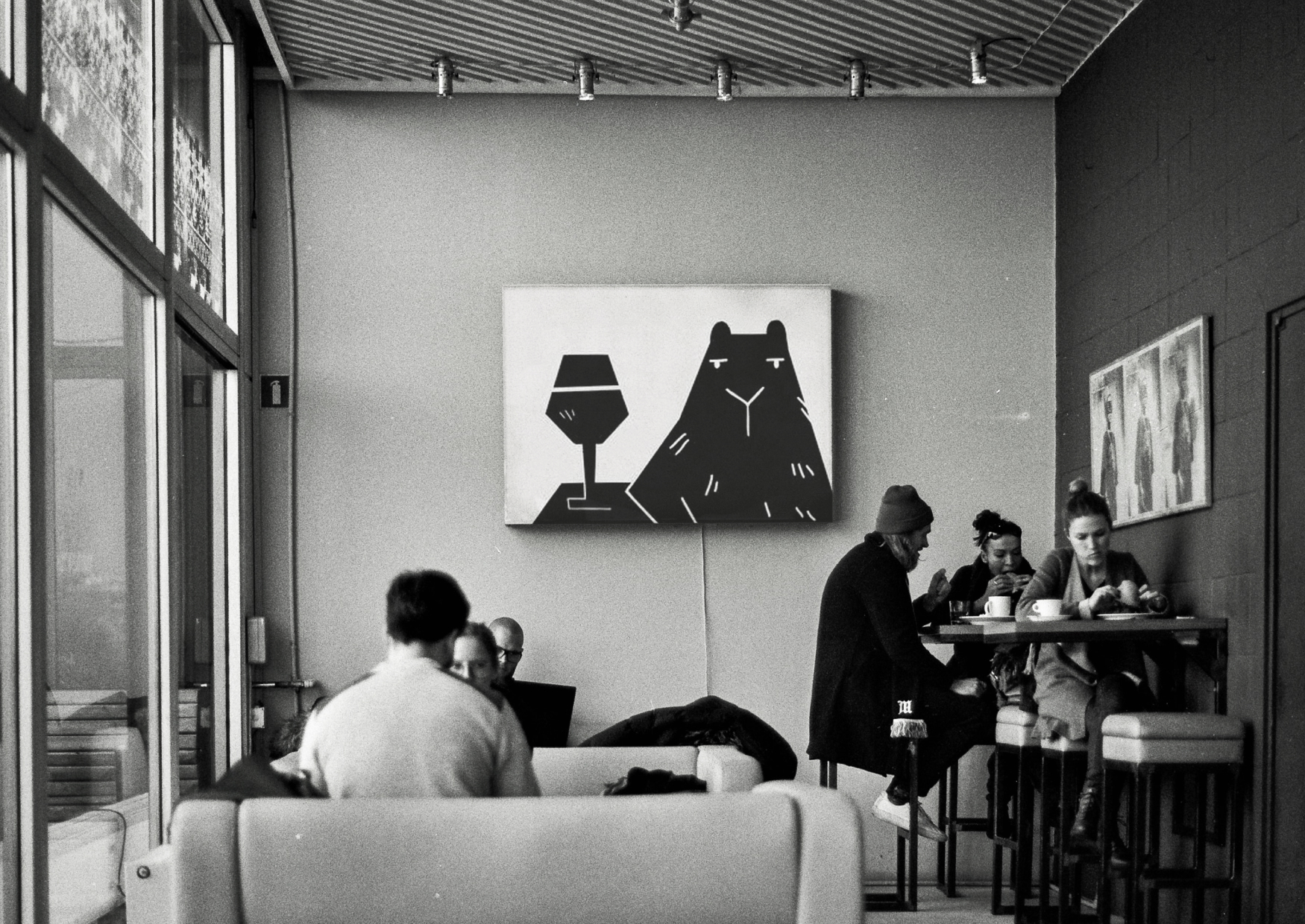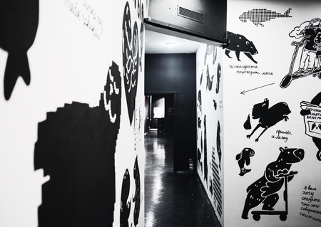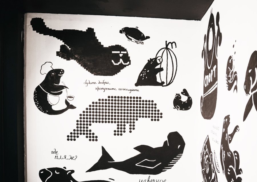 Необходимо было отрисовать по 10 чёрно-белых животных каждого вида, после чего иллюстрации были закомпонованы в единую композицию, дополнены выполненными от руки надписями и перенесены на стены галереи.