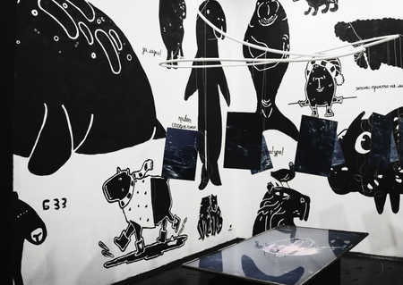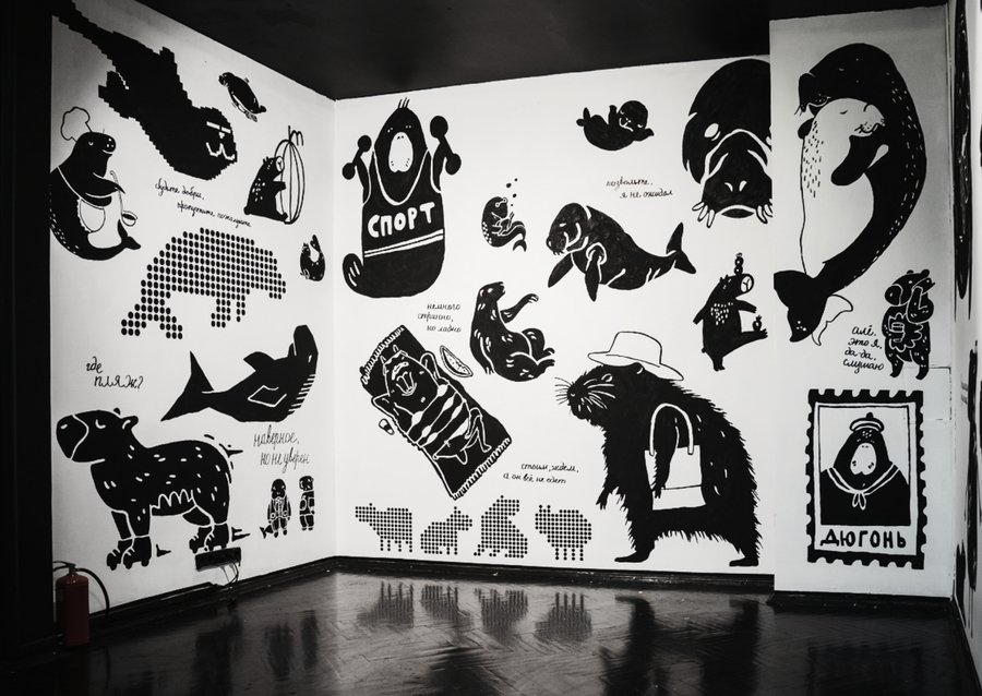 Создание графической монохромной истории для тотальной инсталляции из дюгоней и капибар.