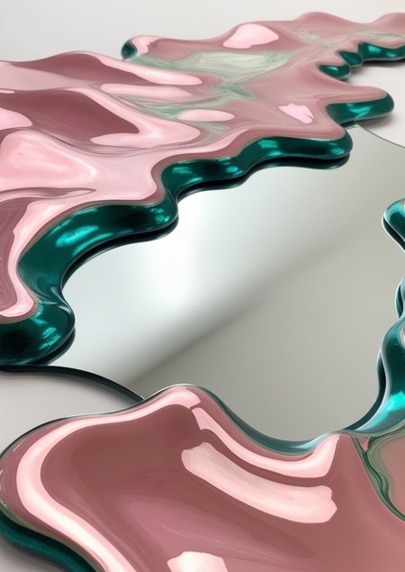 Промт: A flowing mirror surface in mixed media, blending glossy acrylic paint and molten glass, evoking an ethereal, dreamlike quality. The mirror’s undulating waves appear as a mesmerizing topography, reminiscent of celestial bodies or abstract landscapes. Aesthetically, the piece exudes a futuristic, otherworldly aura, with iridescent pink and green hues shifting and shimmering as light catches the surface, creating an ever-changing kaleidoscope of colors, from blushing pastel pinks to emerald greens, inviting the viewer to immerse themselves in its hypnotic depths. Использованные инструменты: Leonardo AI