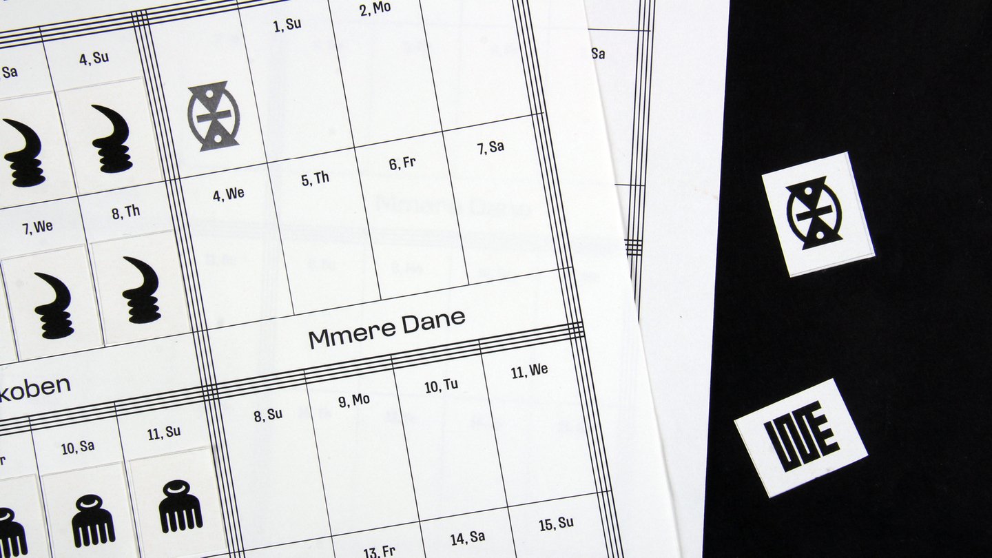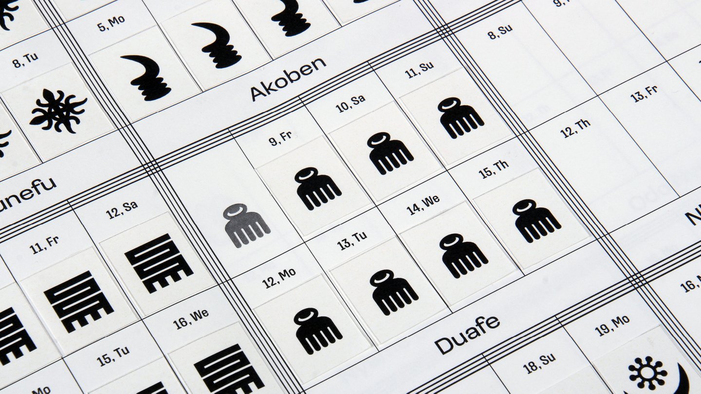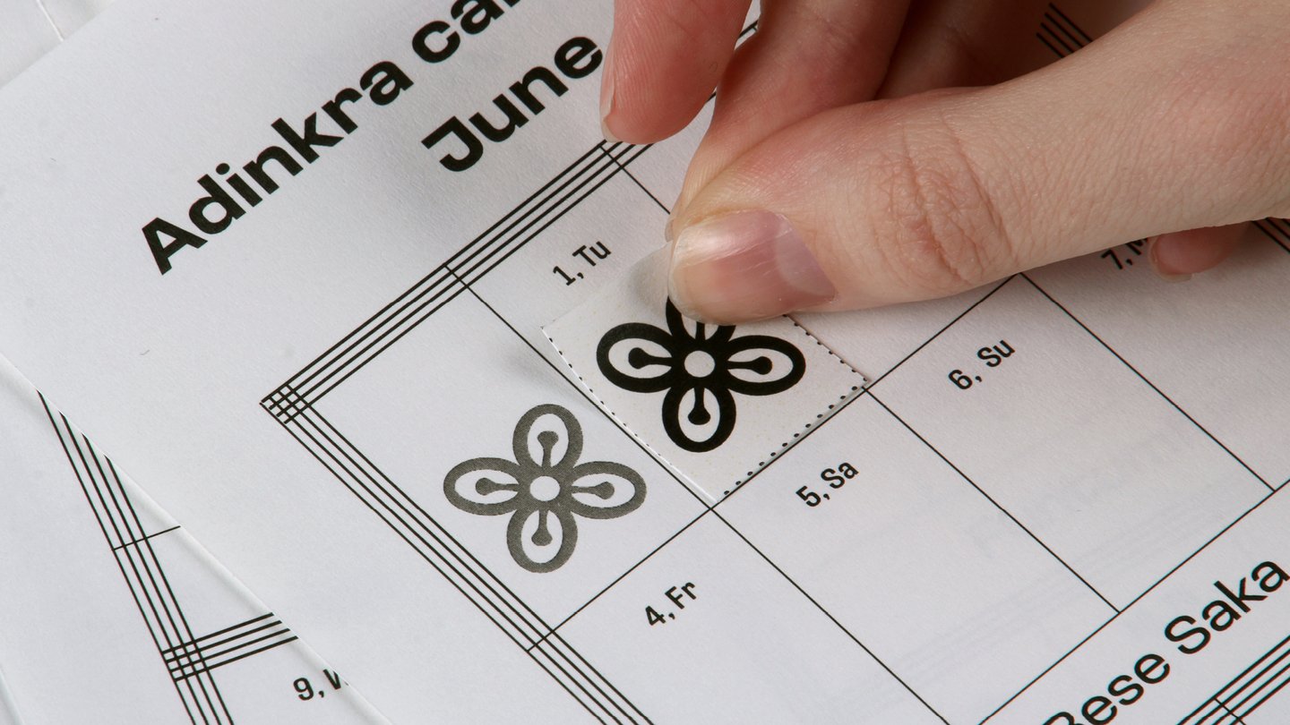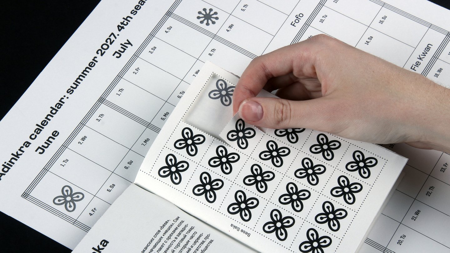 Человек, пользующийся календарем, «создает свое время», приклеивая к дате стикер с символом адинкры, в соответствии с которым он учится жить. По прошествии времени плакат превращается в полотно, заполненное знаками.