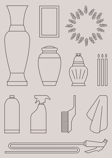 Это принадлежности для ухода за могилами, влагостойкие фоторамки, кладбищенские вазы, неугасимые лампады, урны для праха, хвойные венки и восковые свечи.