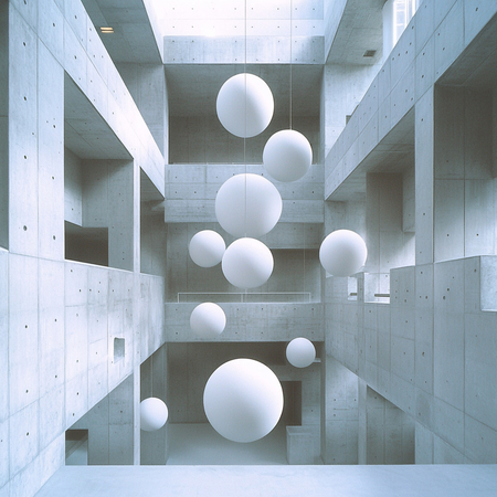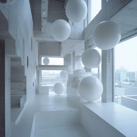 Front view, exterior shot of an apartment building made from white spheres and cubes in Tokyo, designed by Tadao Ando in the style of Tadao Ando.