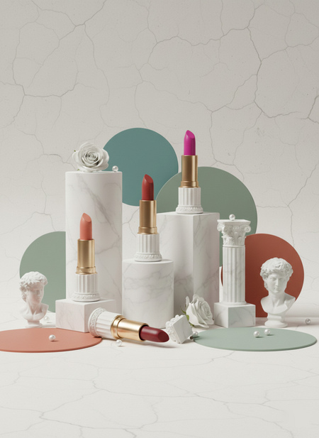 Все началось с нейросети. Я попросила ее смешать два мира: помаду и классические архитектурные колонны. Мне нужны были пять футляров, каждый в стиле своего ордера (дорический, ионический, коринфский, тосканский, композитный), и все это на фоне античных руин.