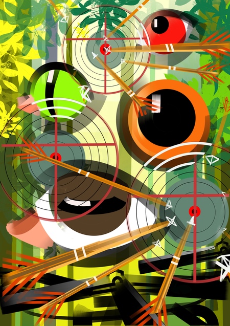 Многообъектная сюрреалистическая иллюстрация на тему охоты с арбалетом. По легенде, заядлый охотник и в тоже время самый крупный коллекционер арбалетов, побывавший в бою много раз, так и не смог никого убить. Ни разу.
