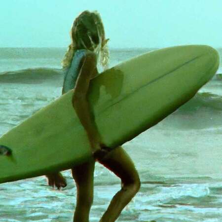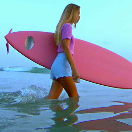 girl models walk with surfboards on the water, light pink shades, surfboards have stickers on them. VHS camera, low resolution, red ligtning --v 6.0 --ar 4:3 --sref https://i.pinimg.com/736x/04/06/f9/0406f94c6c7ba6236be551b5f2e0c1d6.jpg