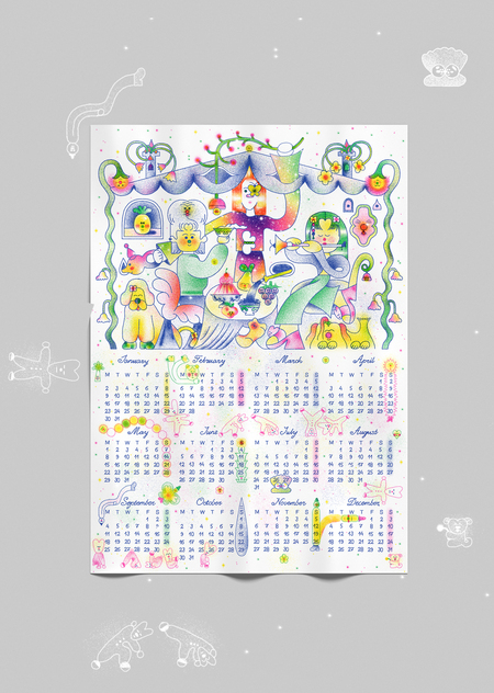 Календарь на 2023 год. Композиционно картинка делится на большую часть с иллюстрацией и нижнюю часть с датами, но в свободном полете встречаются второстепенные персонажи и мини-комиксы. Календарь напечатан на ризографе в мастерской Esh Print.