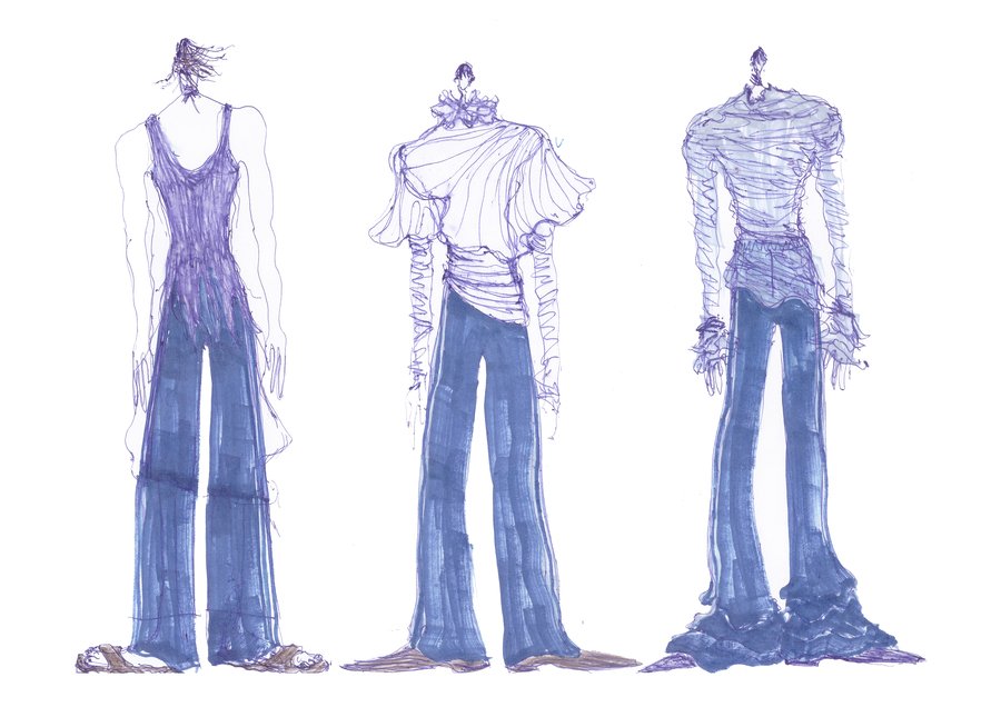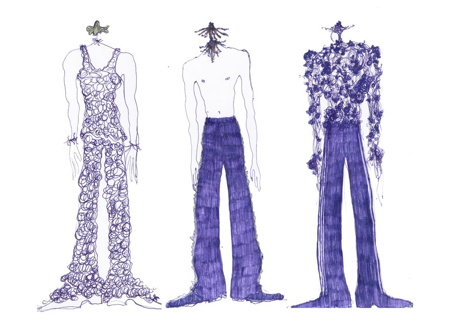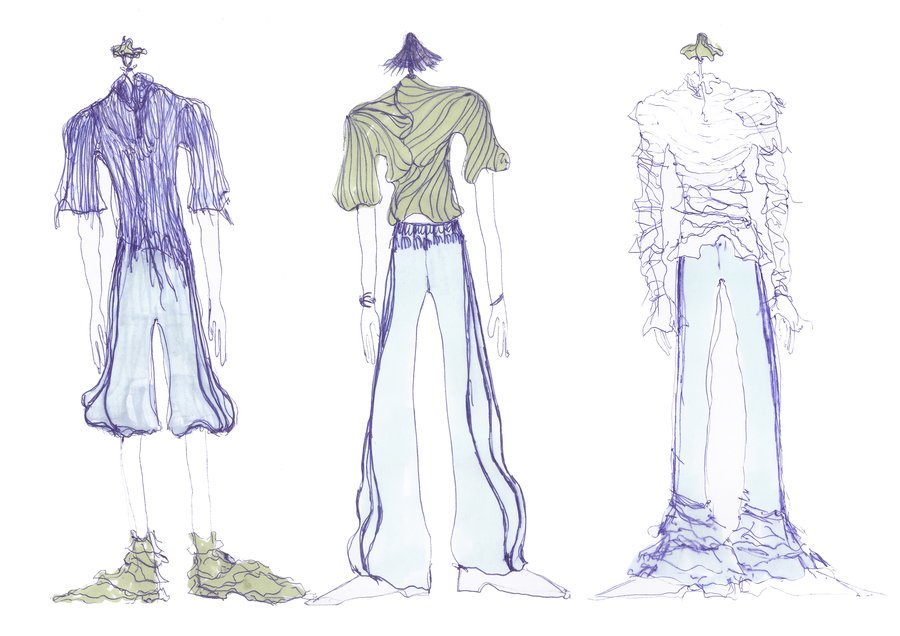 В своей коллекции я вдохновилась антуражем фотографии: зелень, заросли, капуста, спортивные брюки, пропорции — это создает ощущение сюрреалистичности, кадр как — будто в движении, но при этом застывший. Все мы делаем фотографии, создавая замороженный кадр, хранящий в себе воспоминания. Мне стало интересно взглянуть на фотографию со своей интерпретацией происходящего. Для меня она создает ощущение поглощения, природа как-бы затягивает человека в заросли. В коллекции я хотела передать это ощущение застывшей фигуры в зарослях.