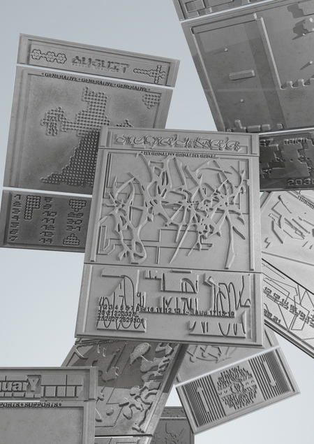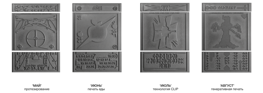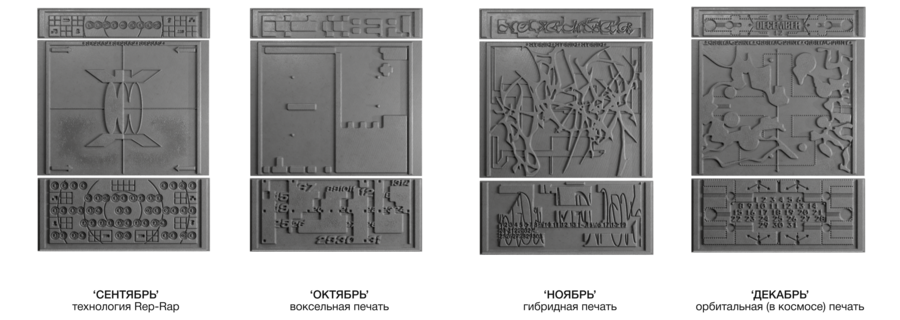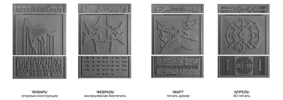 12 листов календаря выполнены в графико‑иллюстративной технике и включают визуальные знаки, отсылающие к явлениям мира 3D‑печати