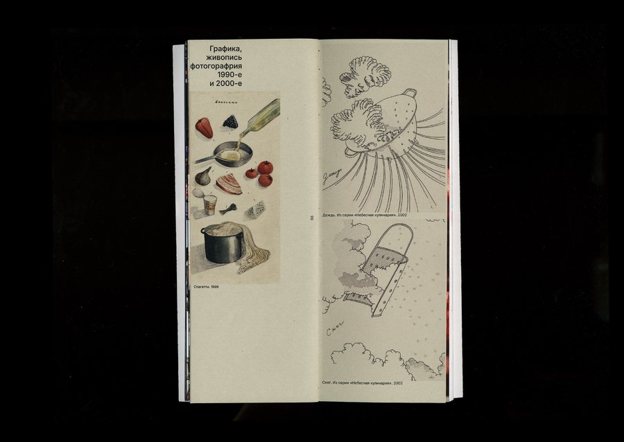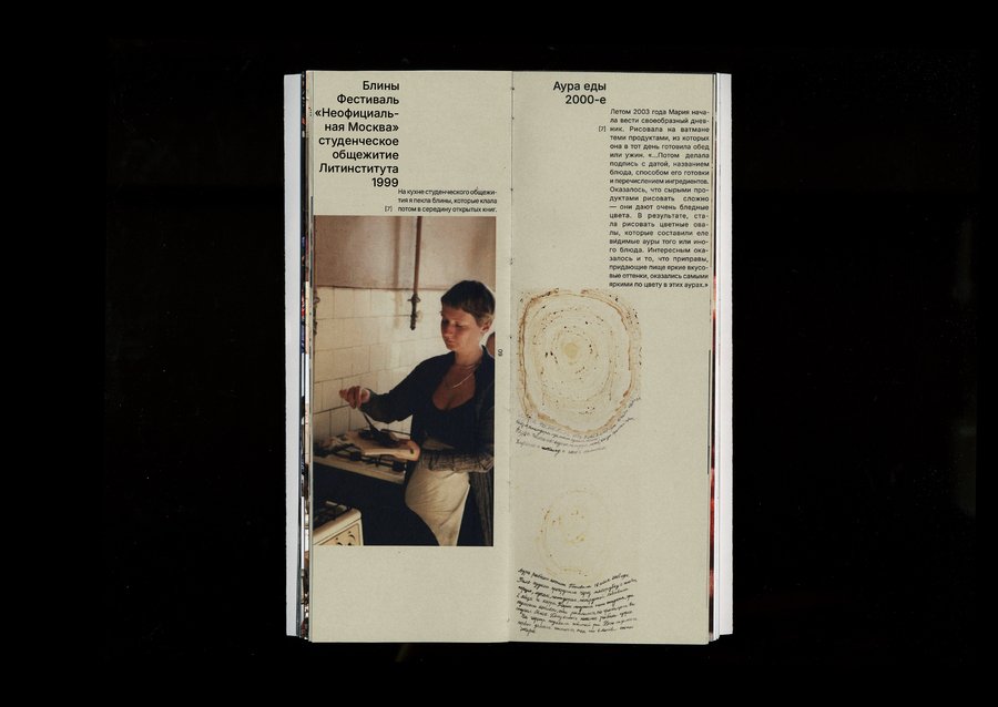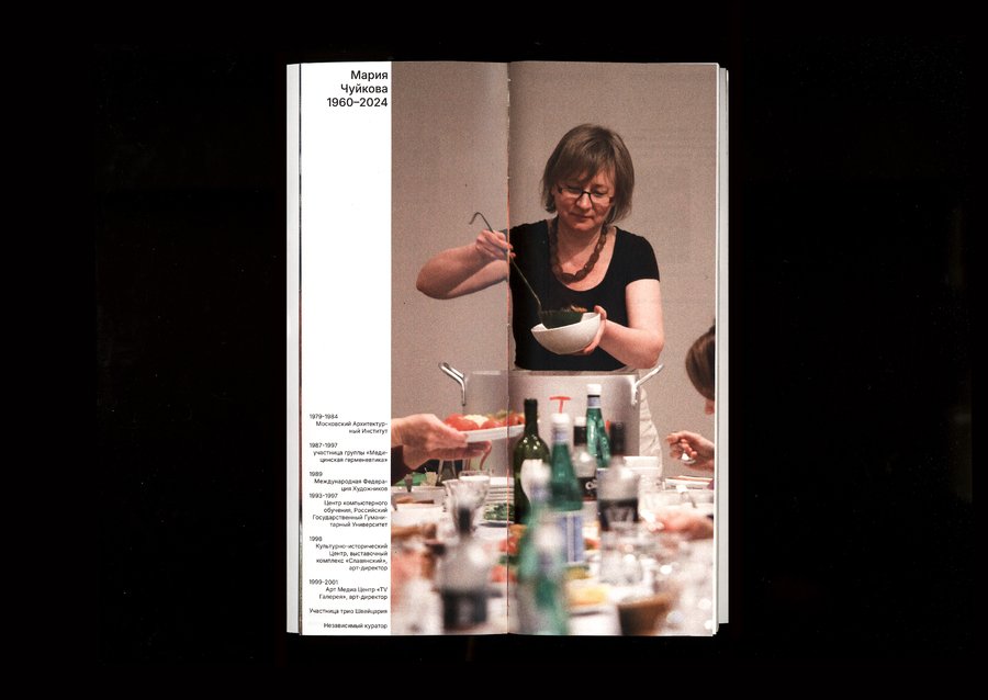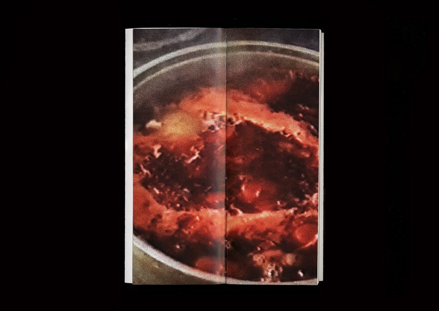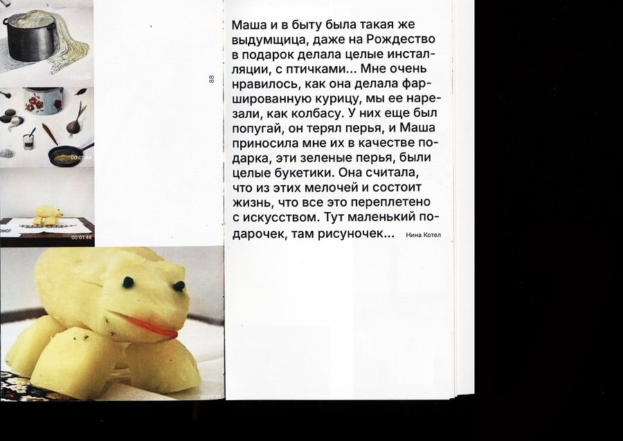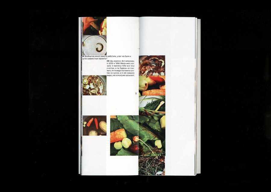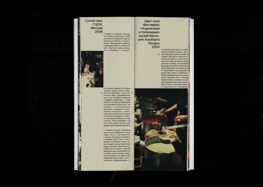 Формат книги — вытяннутый вертикальный — отсылает к длинному кухонному столу, одному из ключевых элементов в искусстве Чуйковой. Перформансы внутри книги представлены в виде ленты из последовательных кадров видео документаций, которых нет в отрытом доступе. Этот прием позволяет читателю восстановить последовательность действий, запечатленных на камеру, и составить представление о самом перформансе. Таким образом я переношу медиум видеоперформанса на бумагу.