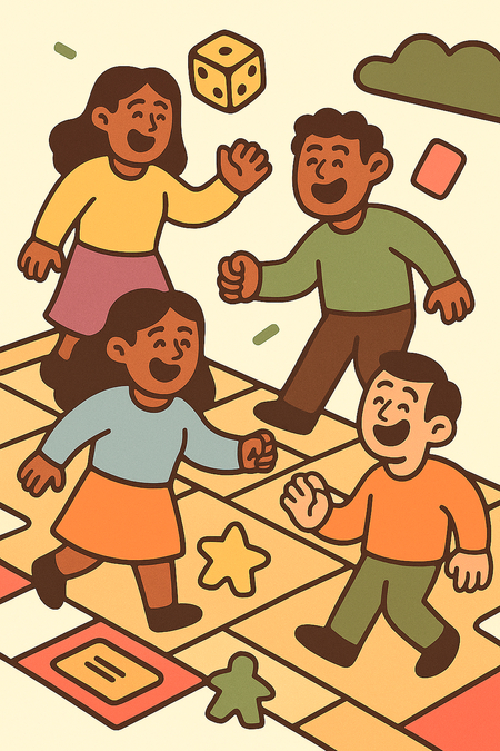Промпт: Сreate an illustration fer the board game store. The picture should show a cheerful family on a huge playing field, as if they were game chips.