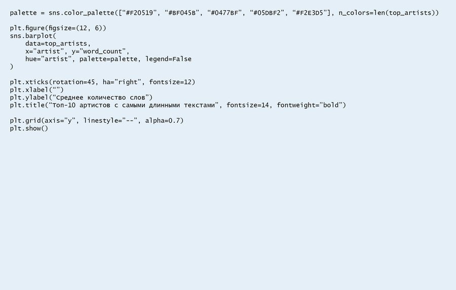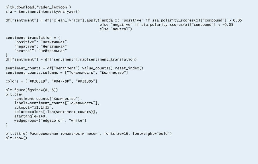Для анализа я выбрала датасет, взятый с платформы Hugging Face и содержащий более 1000 песен различных исполнителей, и изучила, какие темы наиболее часто встречаются в текстах, а также провести анализ на основе таких характеристик, как длина текстов и эмоциональная окраска песен. Все данные были обработаны с использованием Python, для визуализации использовались такие библиотеки, как Matplotlib, Seaborn и WordCloud.