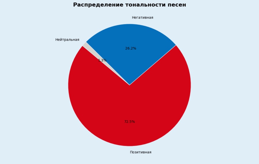 Большая часть песен имеет положительную тональность (72,5%), что подтверждает общее восприятие поп-музыки как легкой, позитивной и развлекательной. Нейтральные и отрицательные песни занимают меньшую долю, что может свидетельствовать о том, что такие песни более редки в поп-жанре.