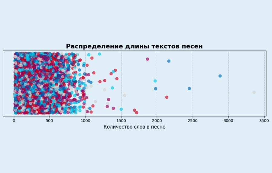 Диаграмма отражает большое количество песен с короткими текстами (до 500 слов), однако на ней также есть песни, содержащие до 3000-3500 слов. Это говорит о том, что музыка может быть как очень лаконичной, так и достаточно объемной, в зависимости от стиля и задуманного исполнителем эффекта.