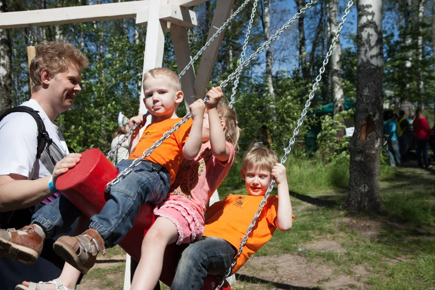 Авторы также поработали над привычной форой качелей — вместо сидений, которые можно встретить в каждом дворе, были созданы самые разнообразные формы: от табуретки до ходуль, держаться на которых нужно было особенным образом. Инсталляция получила неофициальное название «Качельный двор», и во многом оправдывала свое «демократическое» имя: объект стал точкой притяжения для посетителей фестиваля, пространством социализации как детей, так и взрослых. Авторы придумали полустихотворное описание своей работы, которое звучало так: «Чтобы вместе отдыхать и веселиться, / Чтобы не расставаться друг с другом, / Чтобы дружба только крепла, / Чтобы никто не был одинок, / Мы придумали качели».