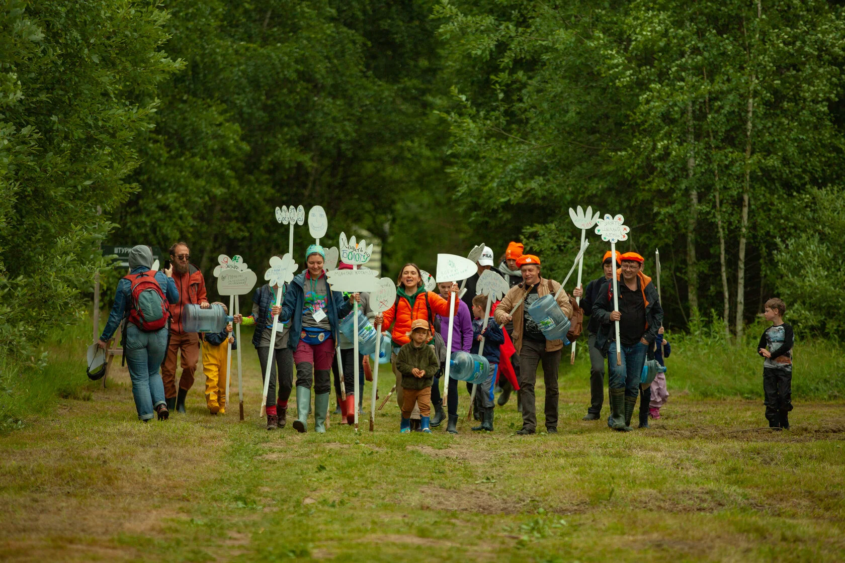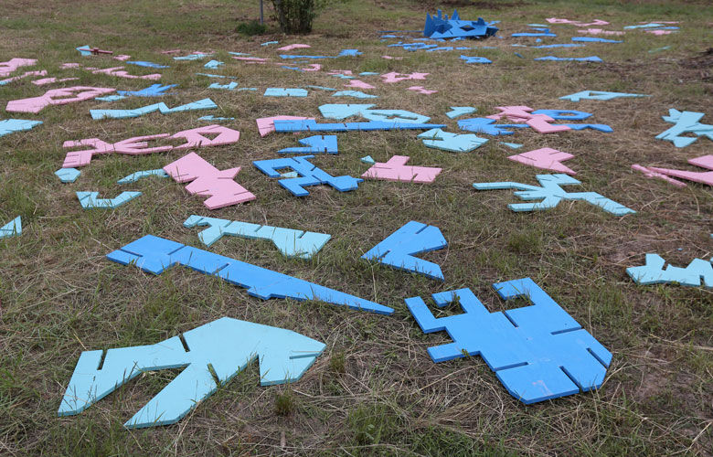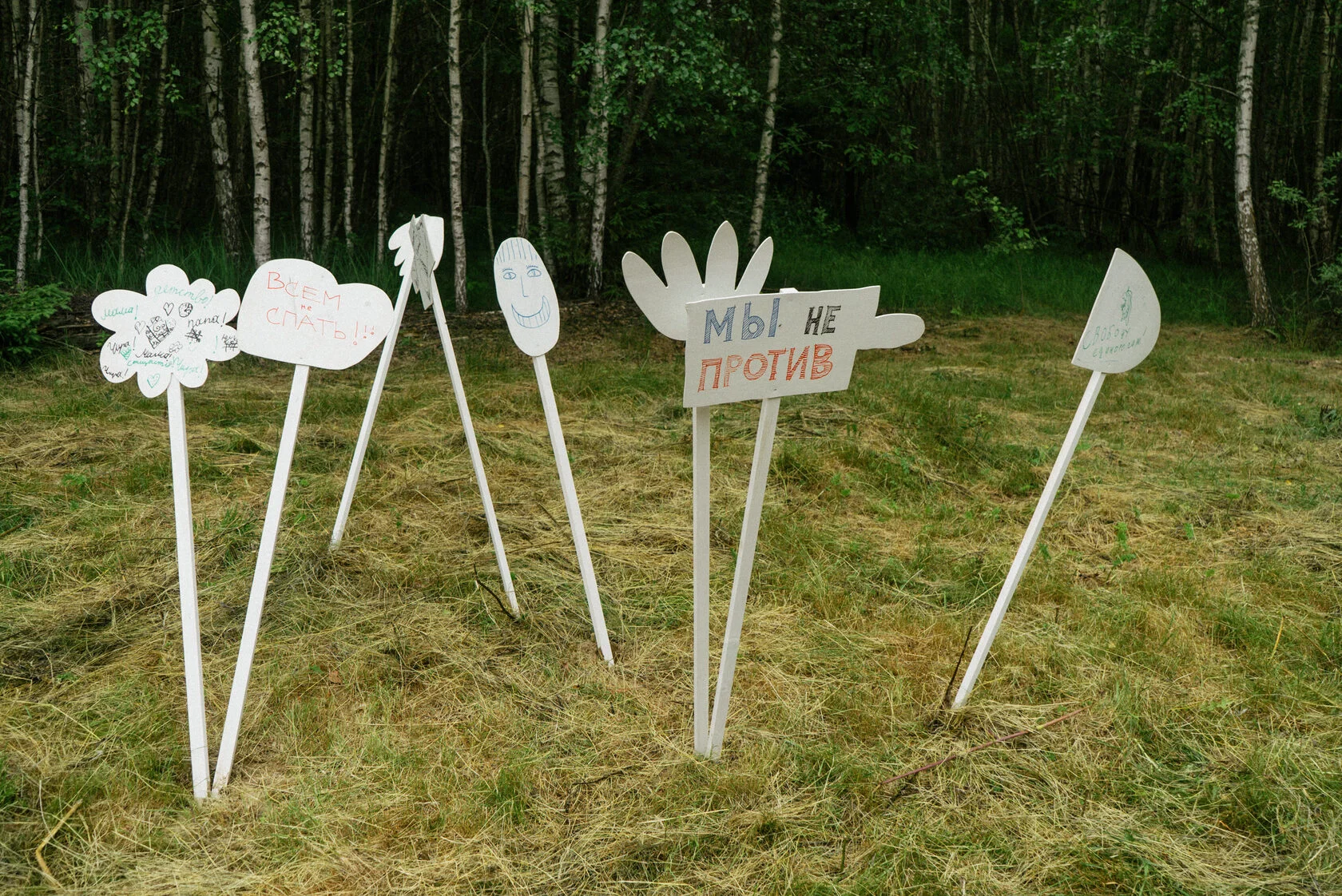 Кроме раскрашивания завершённого объекта, дети также придумали и написали на элементах конструкции собственные лозунги, прибегнув не только к письменному языку, но и воплотив собственные требования (или просто миролюбивые мысли) в рисунках. В результате получился протест без протеста, сохранивший форму, но манифестирующий исключительно гуманистические ценности и идеи.