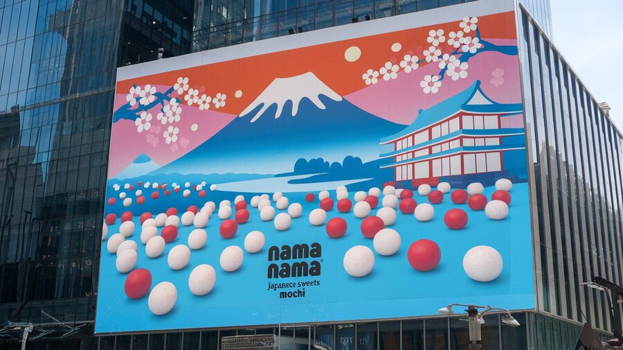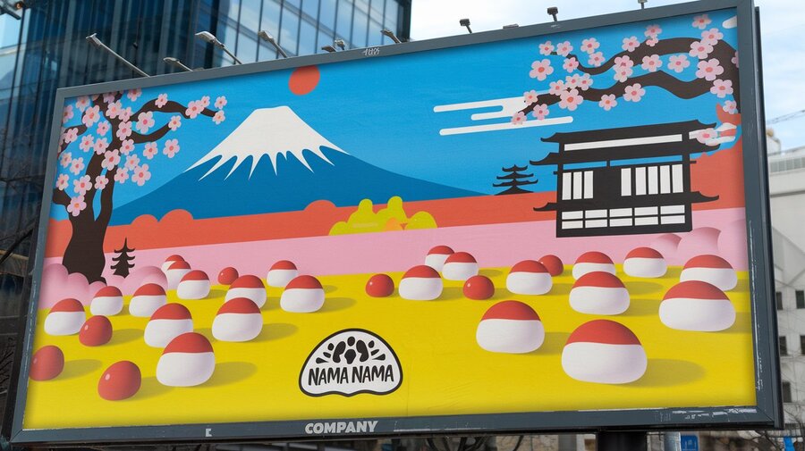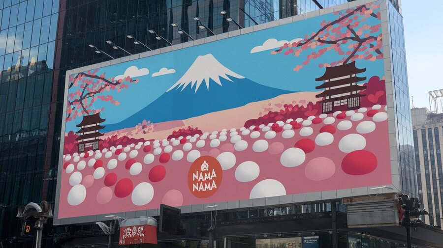 /imagine prompt: A photo of a large billboard in the urban Moscow environment with a bright and colorful advertising poster for Nama Nama, a company producing Japanese sweets mochi. The poster features a minimalist illustration of a Japanese landscape with Mount Fuji, cherry blossoms, and a traditional Japanese house. There are also white and red mochi balls scattered throughout the landscape. The company logo is at the bottom of the poster. The overall design is simple and concise.