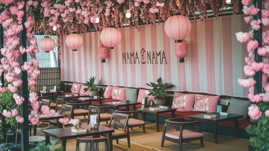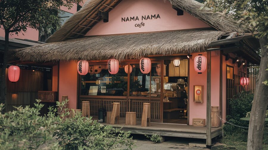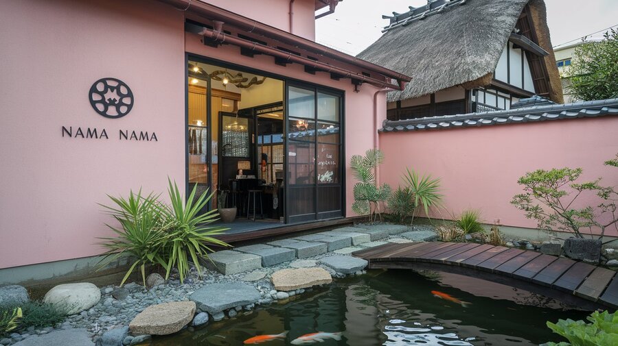 /imagine prompt: A photo of a traditional Japanese-style cafe called Nama Nama. The cafe is in a pink building with a thatched roof. There are pink lanterns hanging outside. The cafe has a wooden exterior and is surrounded by greenery. The overall ambiance is serene and peaceful.