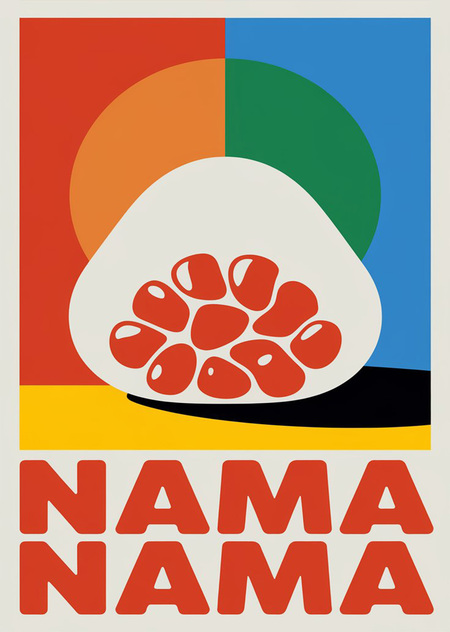 1. A bright and colorful advertising poster for a company producing Japanese sweets mochi. The poster has a white background with large, red text that says «Nama Nama Mochi». There is a large, red illustration of a mochi ball with a green tea dipping sauce. The poster also includes a few smaller illustrations of mochi balls and green tea leaves. The company logo, «Nama Nama», is written in simple, concise, minimalist font at the bottom of the poster. 2. An advertising poster for a company producing Japanese sweets mochi. The poster is bright and colorful, with a minimalist design. The main image is a white mochi with red bean paste filling. The background is white. There is the text «Nama Nama» in red at the bottom. The overall design is simple and concise, with a focus on the mochi and the company name. 3. A bright and colorful advertising poster for Nama Nama, a company producing Japanese sweets mochi. The poster features a minimalist illustration of a Japanese landscape withMount Fuji, cherry blossoms, and a traditional Japanese house.