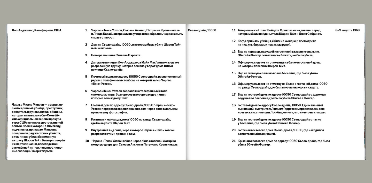 Присутствие — это арт-проект, который представляет собой сборник фотографий, связанных с серийными преступлениями. Он затрагивает темные уголки человеческой природы, документируя серийные преступления. Книга призвана не только зафиксировать факты, но и вызвать глубокие размышления.