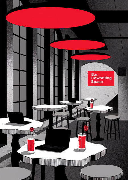 (1) Prompt: Photo divided into two parts, showing the same bar coworking space. On the left, it’s nighttime with dim lighting and red light sources. Cocktails are placed on stone tables with uneven edges, and in the distance, blurred people are socializing and having fun, with the focus on the interior. Red posters and large windows are visible in the background. On the right, it’s morning, with people in the distance drinking coffee and working at stone tables with uneven edges, using MacBooks. In the background, there’s a bar counter, red posters, large windows, and the same stone tables.
