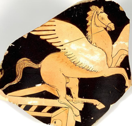 Пегас — «… в греческой мифологии крылатый конь, который появился из капель крови горгоны Медузы, когда ей отрубил голову Персей. От удара копытом П. на горе Геликон забил чудесный источник Ипокрена, дающий вдохновение поэтам. На Олимпе П. подносил Зевсу громы и молнии».[4]