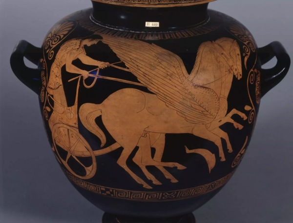 Беллерофонт верхом на Пегасе, убивающий Химеру, краснофигурная амфора, ок. 330–310 до н. э. / Эос на колеснице, краснофигурный стамнос, ок. 440 до н. э., приписывается мастеру Мидаса, Британский музей