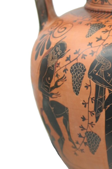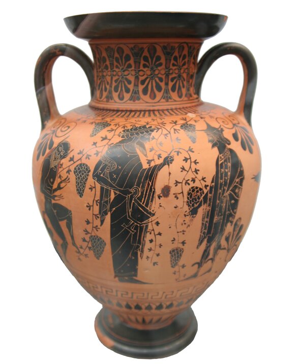 Греческая ваза из Аттики, 550–520 гг. до н. э. Дионис беседует с Гермесом, а слева — танцующий силен.