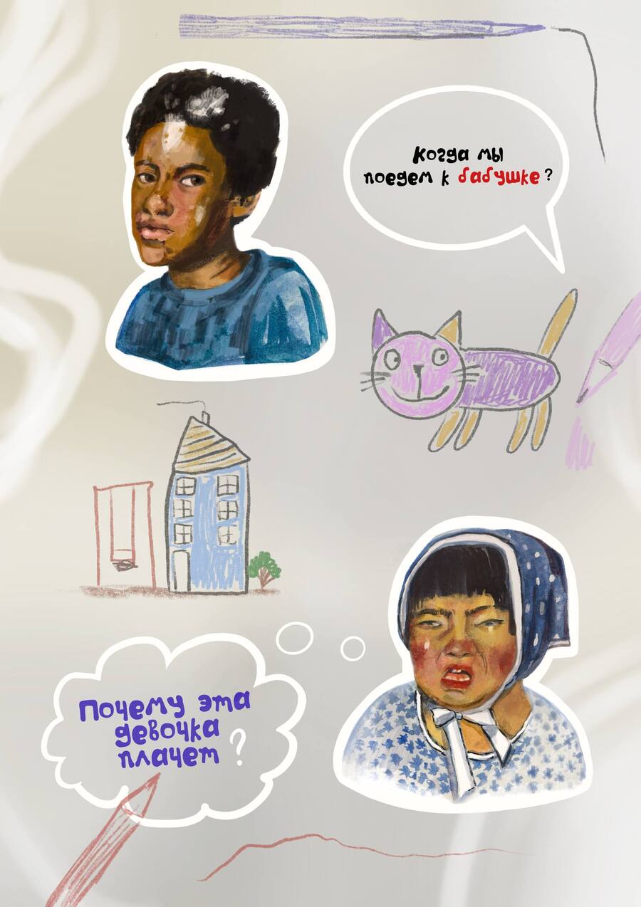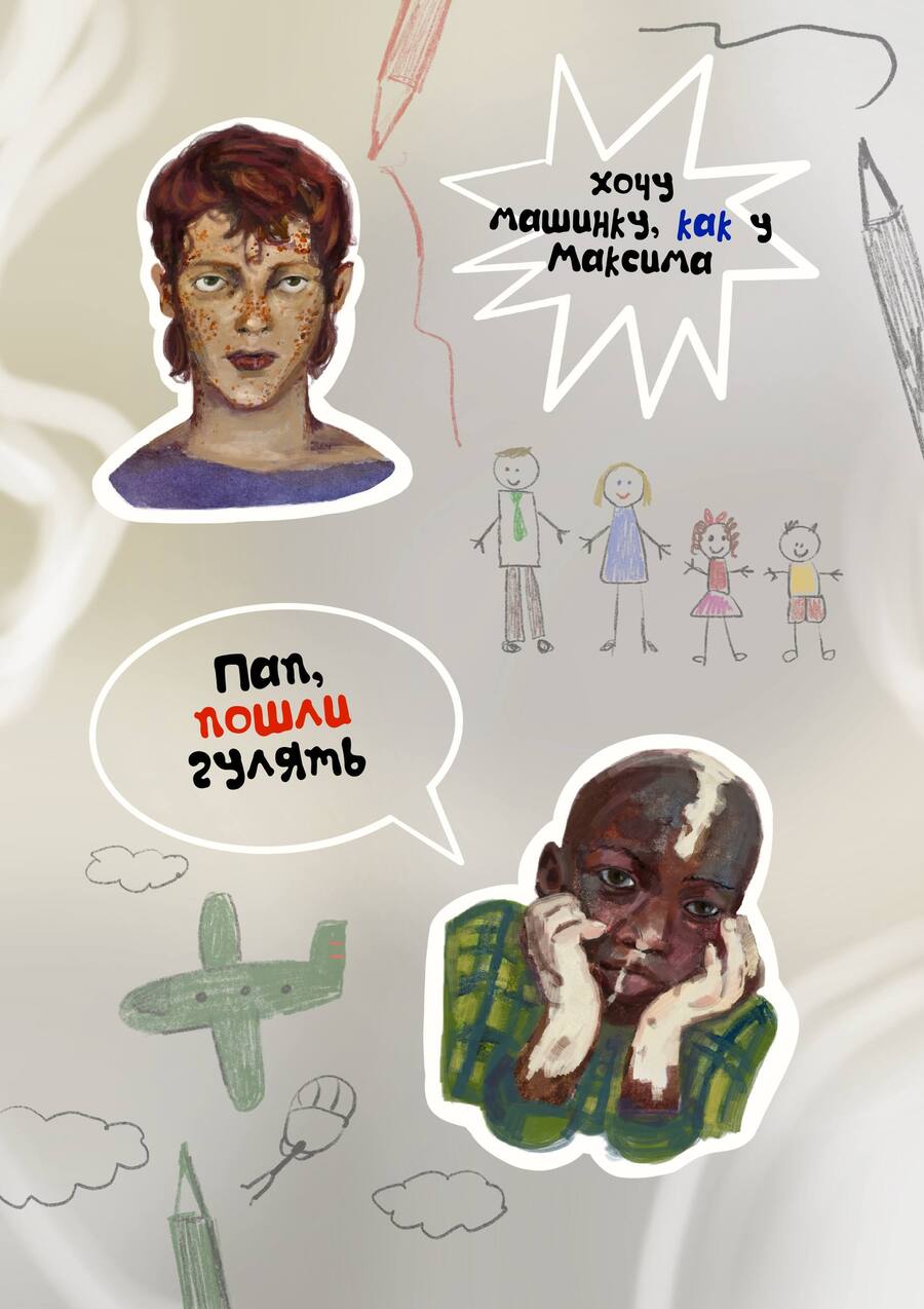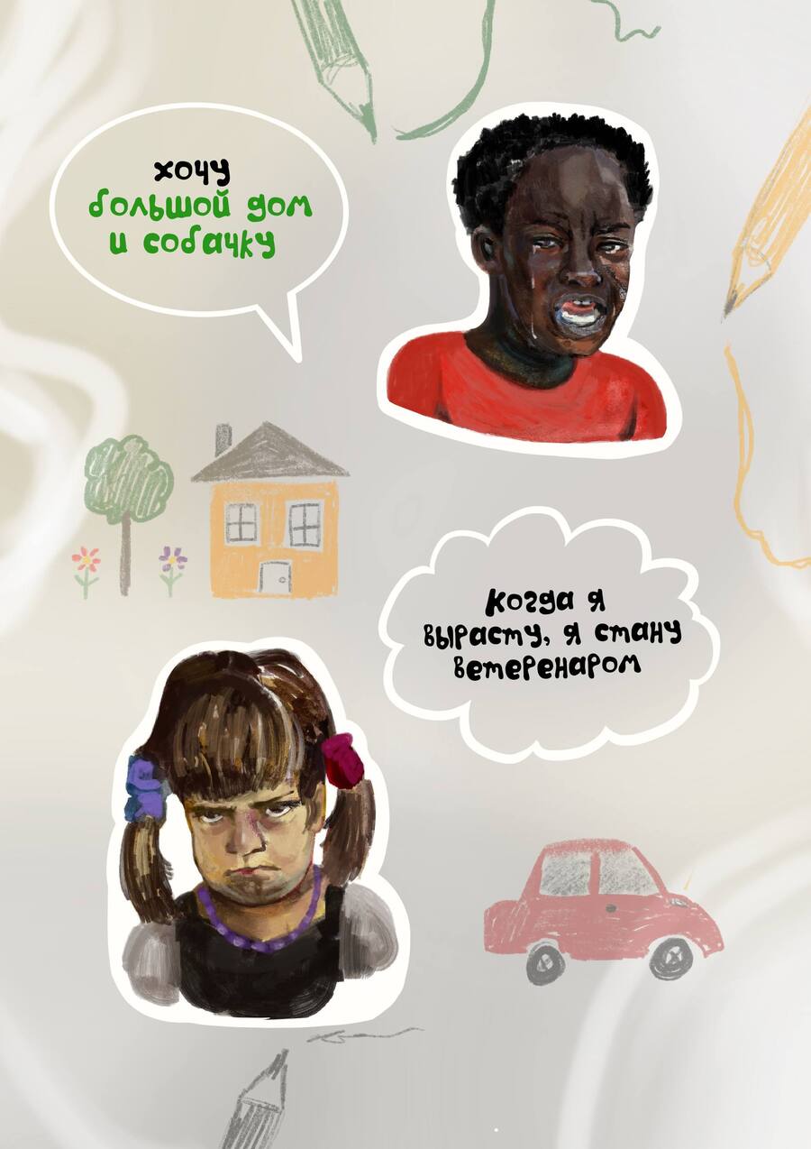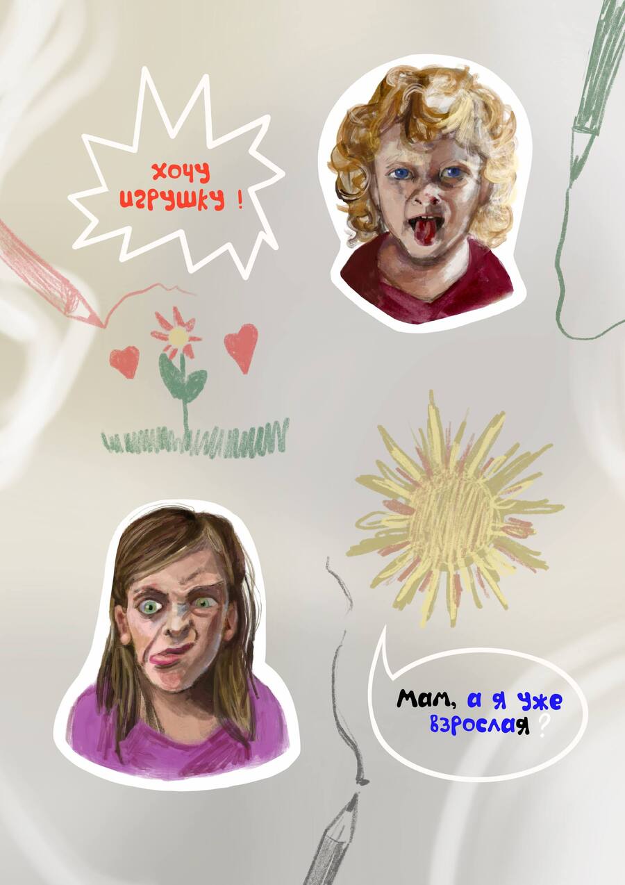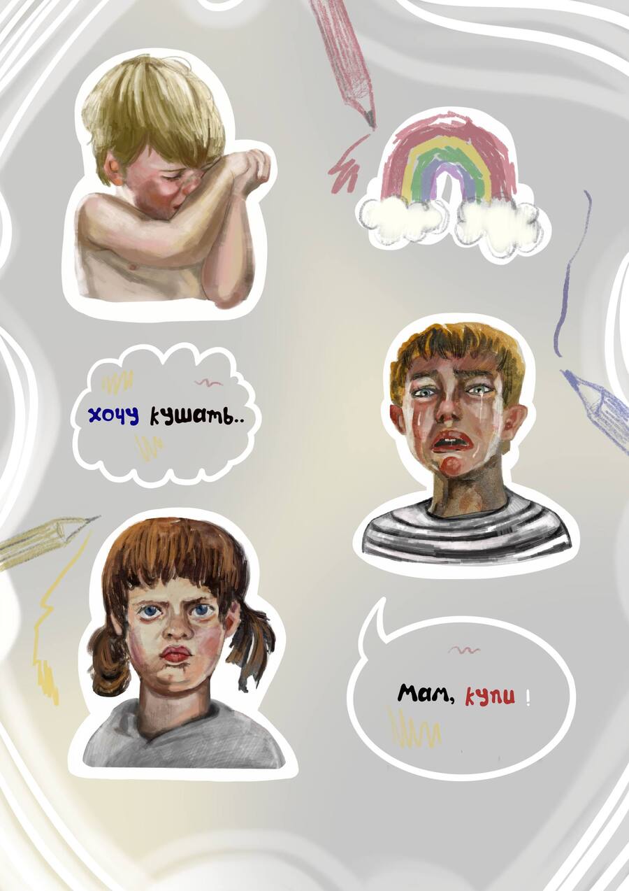 Мой итоговый проект — серия стикеров, посвящённых детству как социальной и визуальной теме. Я осознала, что редко изображала детей, хотя их лица — одни из самых выразительных: эмоции сменяются мгновенно, жесты остаются честными. В серии я показываю палитру детских эмоций — радость, любопытство, задумчивость, упрямство, обиду, восторг — и разнообразие культурного опыта: разные оттенки кожи, прически, детали одежды, а также индивидуальные особенности.